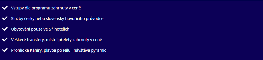 1 | Odlet z České republiky, přílet do Káhiry, transfer do 5* hotelu, ubytování, večeře. | |||