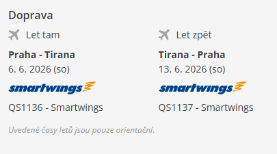 letecká přeprava Praha-Tirana-Praha včetně všech letištních tax a poplatků, doprava klimatizovaným autobusem dle programu, 7x ubytování ve 4* hotelích s polopenzí, 2x tradiční balkánská večeře, služby česky či slovensky hovořícího průvodce, služby místního průvodce dle potřeby, poplatek za vstup do města Kotor, zákonné pojištění ve znění zákona č. 159/99 Sb.